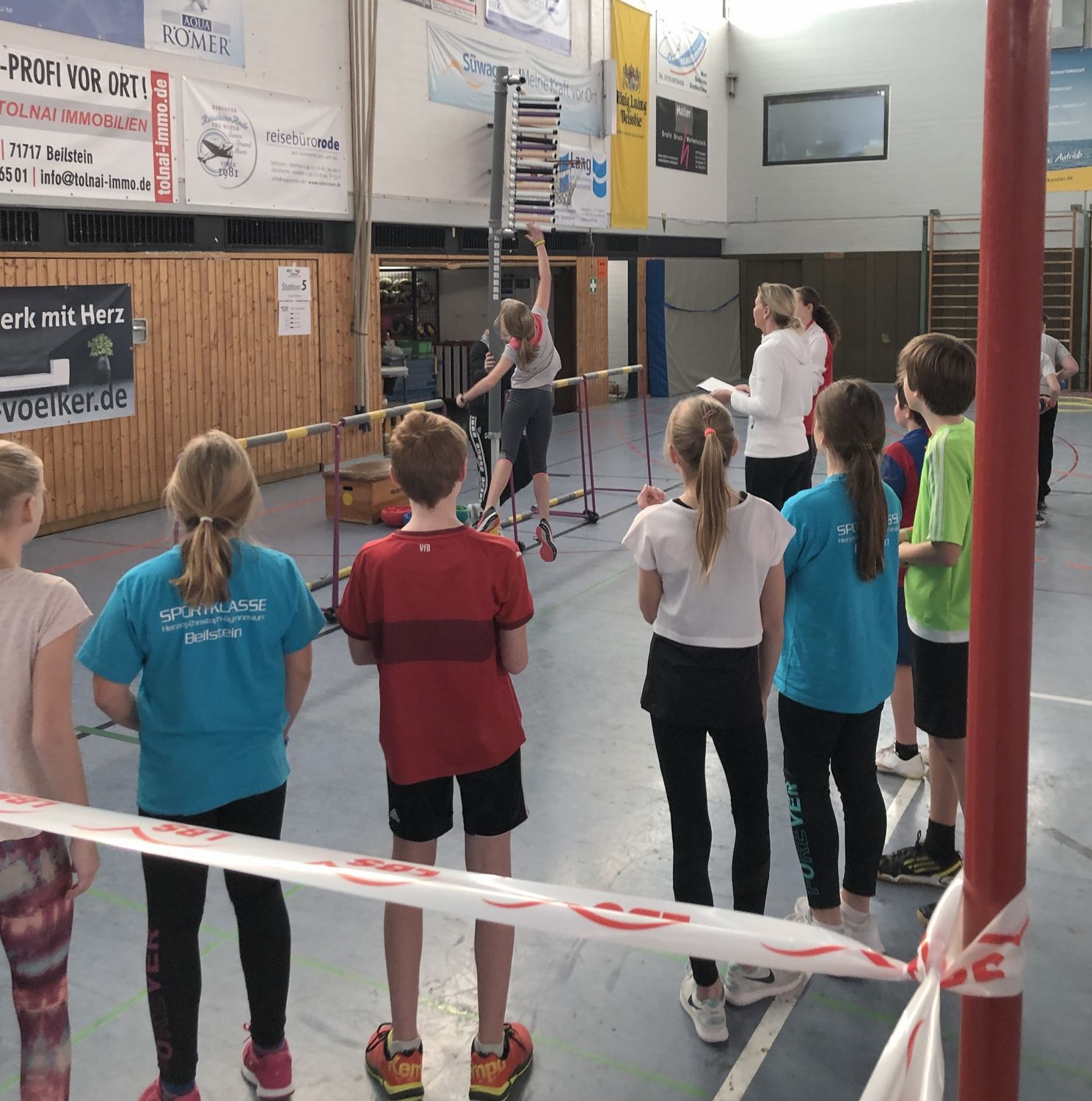 Der Schülerinnen und Schüler, die alle den Sportzug der Schule ausgewählt hatten, machten ihrem Namen alle Ehre und erkämpften sich des Öfteren das rote Armband. Auch die im darauffolgendem Durchgang antretenden Fünftklässler legten nicht weniger Ehrgeiz an den Tag. Mit voller Begeisterung wurde geworfen, gesprungen und gesprintet und viele rote Bänder schmückten die Arme der über 160 Kids.