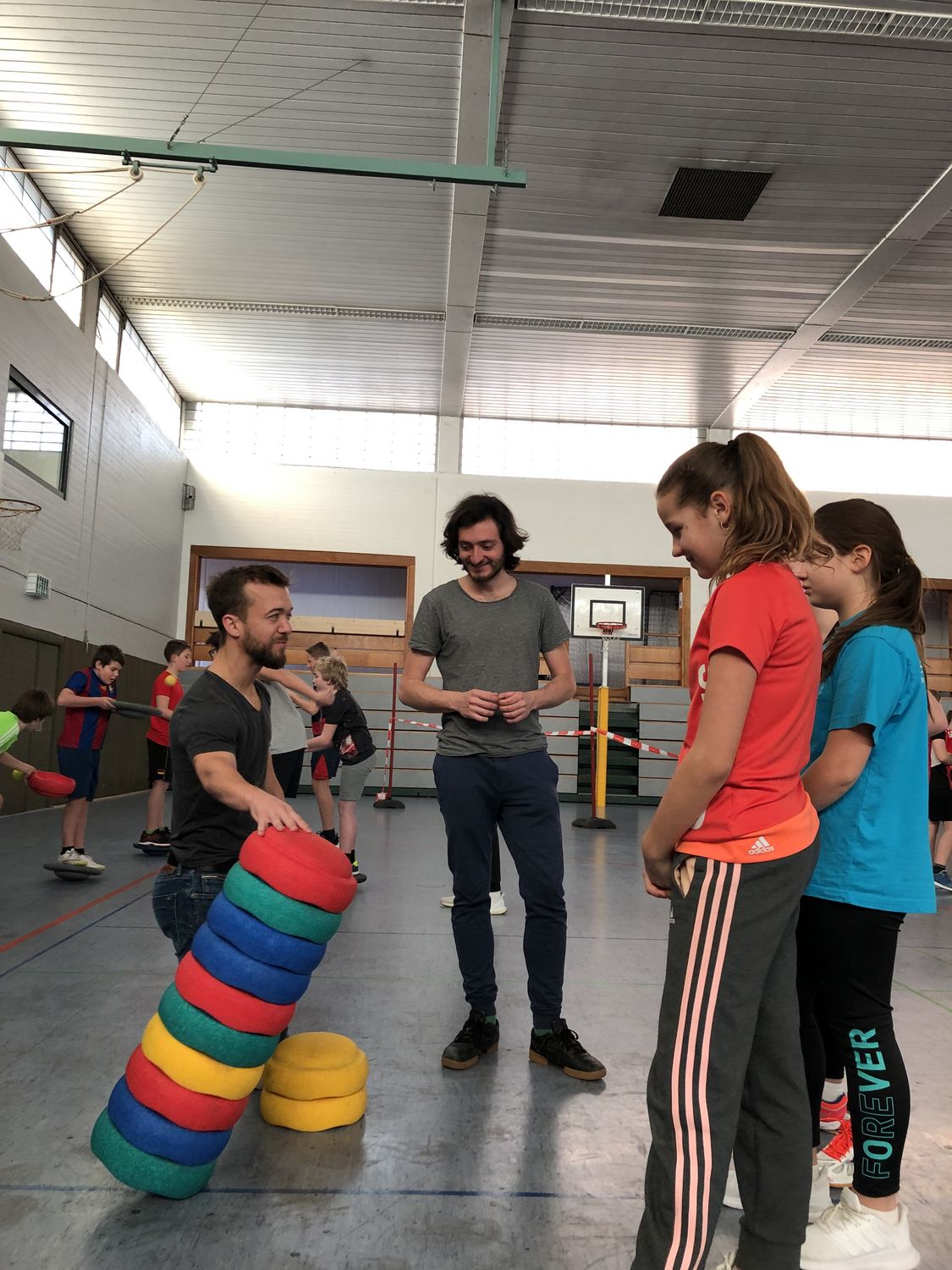 Schon früh am Morgen traf sich das WLV-Team mit den Lehrern und Helfern der Schule sowie der Spvgg Bissingen um die Halle für das anstehende Event einzurichten. Um 7:40 Uhr fand dann der Startschuss für die fünften Klassen statt. Noch bevor es so richtig losging, tobte schon der erste Applaus durch die Sporthalle: Achtfacher Deutscher Meister, erfolgreicher EM- und WM-Teilnehmer sowie Team-Europameister - das waren die Erfolge, die den Top-Athleten für diese Veranstaltung ankündigten und die Kinder in großes Staunen versetzten. Der 400m-Hürden-Läufer Felix Franz von der LG Neckar-Enz ließ es sich nicht nehmen bei der Veranstaltung direkt vor seiner Haustüre mit dabei zu sein. Ihn durften die Kids bei der Station unseres Partners Stapelsteine näher kennenlernen und Geschicklichkeitsübungen machen sowie kleine Spiele mit ihm spielen.