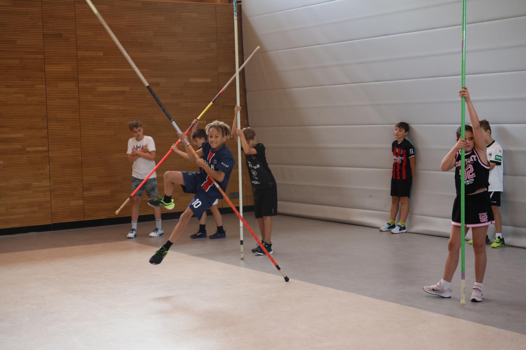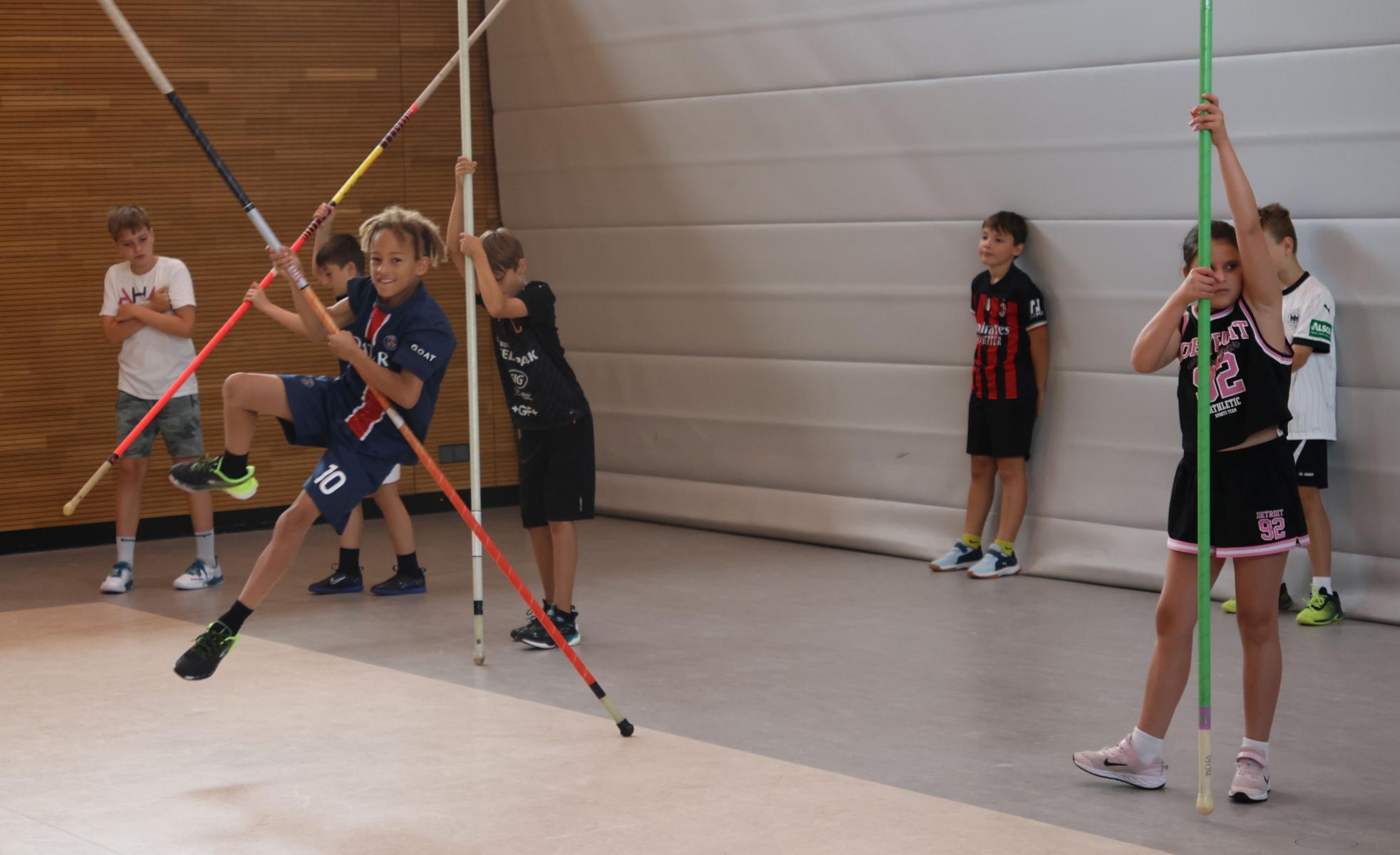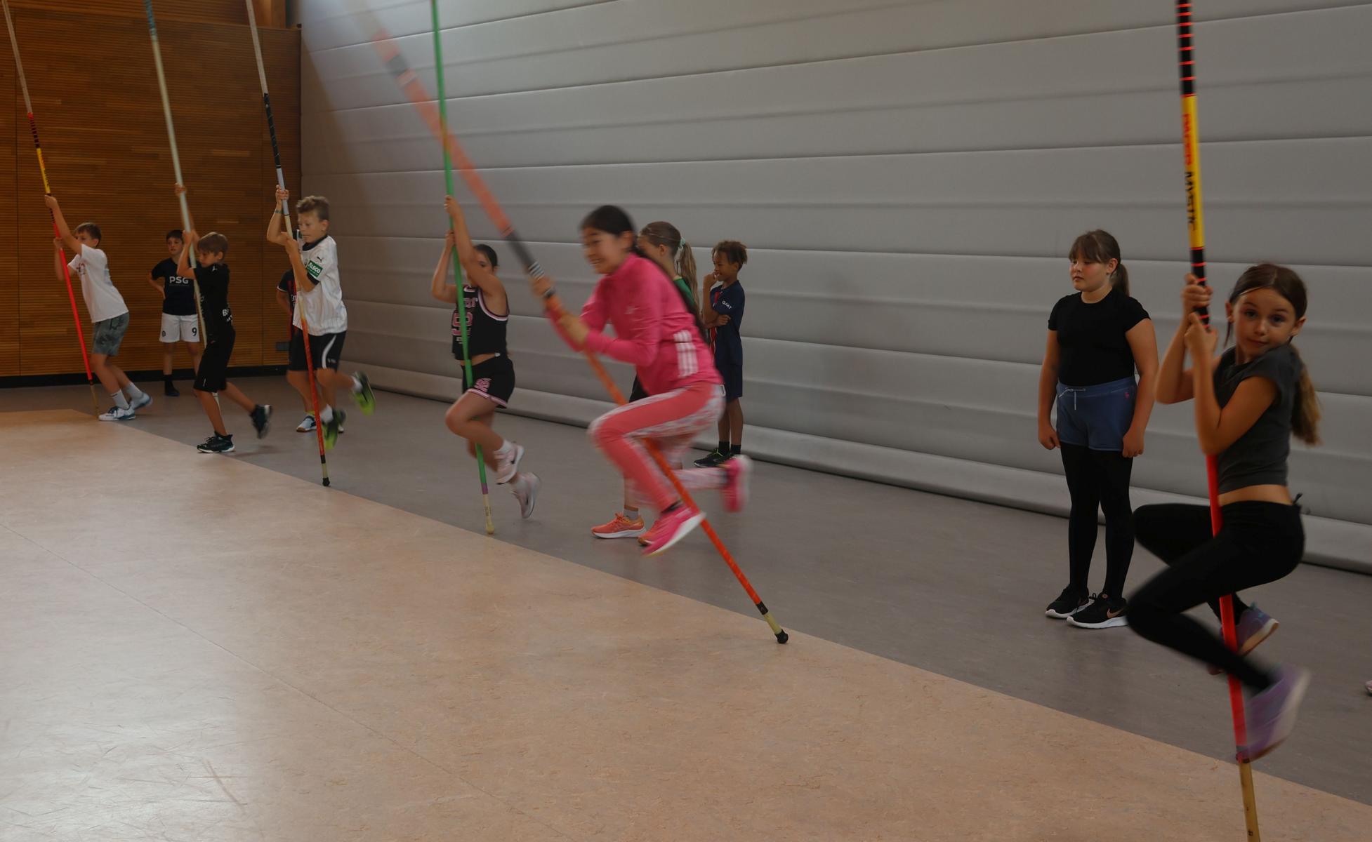 In vier Doppelstunden lernten die Kinder vielfältiges Laufen, Springen und Werfen kennen. Eine besondere Einheit war dabei das Springen mit dem Stab, in der die Kinder sogar Stabhochsprung an verschiedenen Stationen in einfacher Form ausprobieren konnten. Das Gefühl des Getragenwerdens und des Fliegens ist der besondere Anreiz.