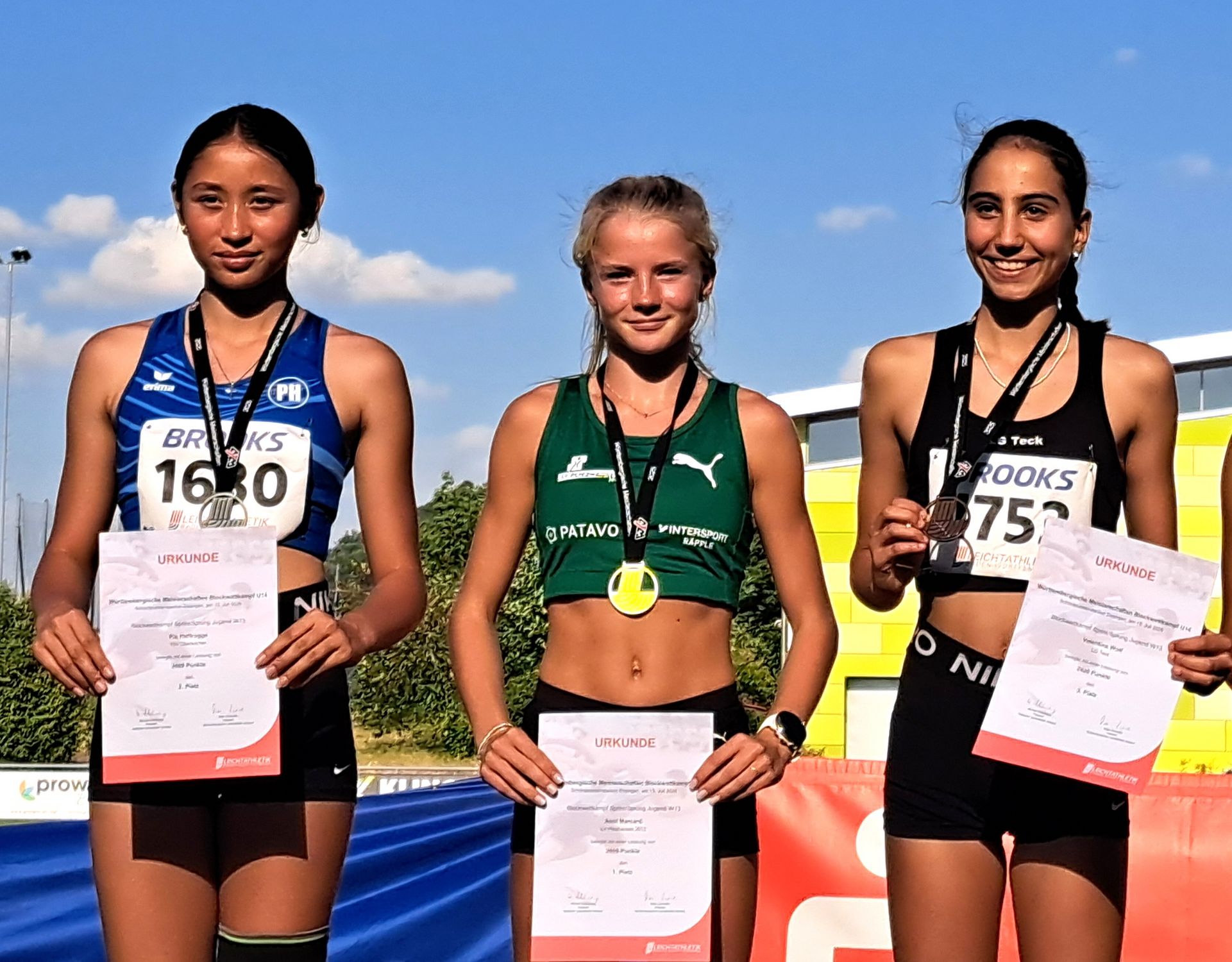 Im Blockwettkampf Wurf der W13 durfte sich einmal mehr der LV Pliezhausen 2012 über einen Titel freuen. So konnte Nina Schlecht mit 2.331 Punkten ihre Konkurrenz um die beste Kugelstoßerin Mila Debeauvais (LAV Stadtwerke Tübingen; 2.188 Punkte) und die zweitbeste Diskuswerferin Lea Yamina Brauer (LG Hohenlohe; 2.148 Punkte) auf Distanz halten. Sie konnte neben soliden Wurfergebnissen vor allem mit sehr schnellen Sprint- und Hürdenleistungen aufwarten. Deutlich enger ging es dagegen im Blockwettkampf Lauf der W13 zu. Hier setze sich Matilda Marie Maier (TSV Erbach) mit einer Gesamtpunktzahl von 2.389 Punkten durch, zu der vor allem ihre Zeit von 2:32,38 Minuten über 800m beitrugen. Der Rückstand der Silbermedaillen-Gewinnerin Leni Echteler (LV Pliezhausen 2012) betrug nur winzige 13 Punkte. Bronze sicherte sich Carlotta Froese (Spvgg Holzgerlingen) mit 2.337 Punkten. Überragende Athletin im Blockwettkampf Sprint/Sprung der W13 war Anni Marcard vom LV Pliezhausen 2012. Die Tagesbestleistungen über 75m, 60m Hürden, im Weitsprung und im Hochsprung sowie ein starker Ballwurf brachten ihr hervorragende 2.809 Punkte und damit die Goldmedaille ein. Dahinter wusste auch Pia Hoffrogge (TSV Oberkochen) auf dem Silberrang zu überzeugen, denn ihre Punktzahl von 2.609 Punkten hätten im Vorjahr noch zum Sieg gereicht. Über Bronze und den besten Ballwurf des Tages durfte sich Valentina Wolf von der LG Teck (2.420 Punkte) freuen.