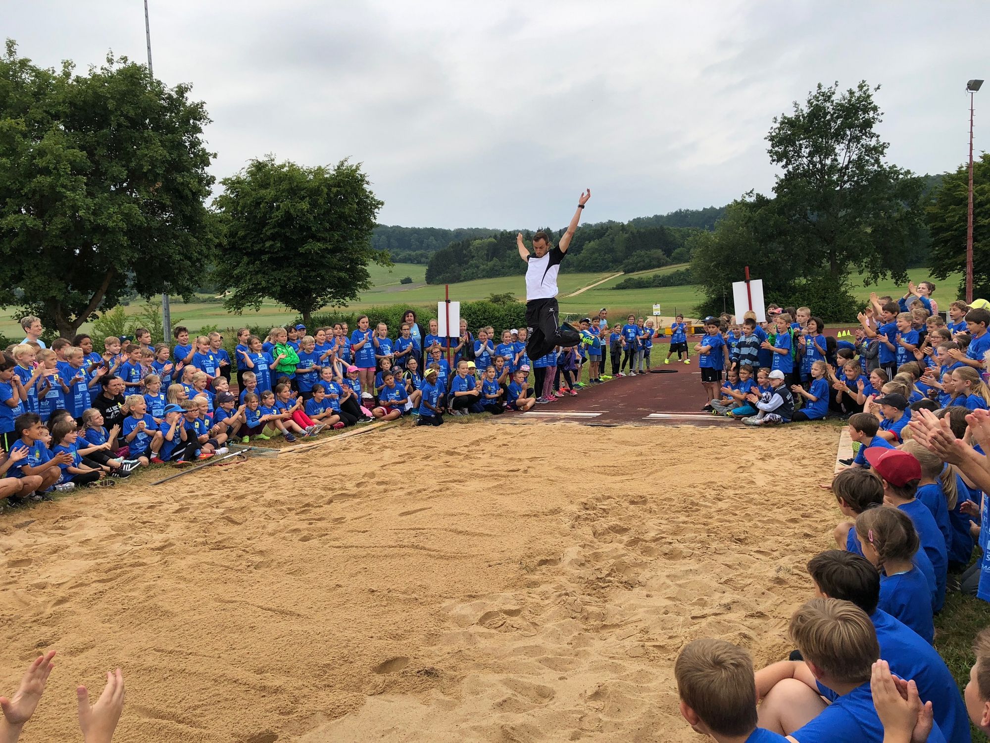 Damit WLV-Praktikantin und Dreispringerin Maike Anstett für die Deutschen U23-Meisterschaften am kommenden Wochenende geschont wurde, moderierte sie die gesamte Veranstaltung und Rene übernahm an diesem Tag auch die Weitsprung-Vorführung. Er konnte sich dabei eindrucksvoll von Sprung zu Sprung steigern und weckte bei vielen Kindern eigenen Ehrgeiz. Diese konnten ihr eigenes Sprungvermögen direkt bei der "Weitsprungstaffel" testen. Anhand einer Messlatte, auf der Zonen im 25cm-Abstand eingezeichnet sind, können sie sofort eine Rückmeldung über ihre Sprungweite bekommen und versuchen daraufhin, ihre Bestweiten zu überbieten. Oft bricht dabei auch ein klasseninterner Wettstreit aus.