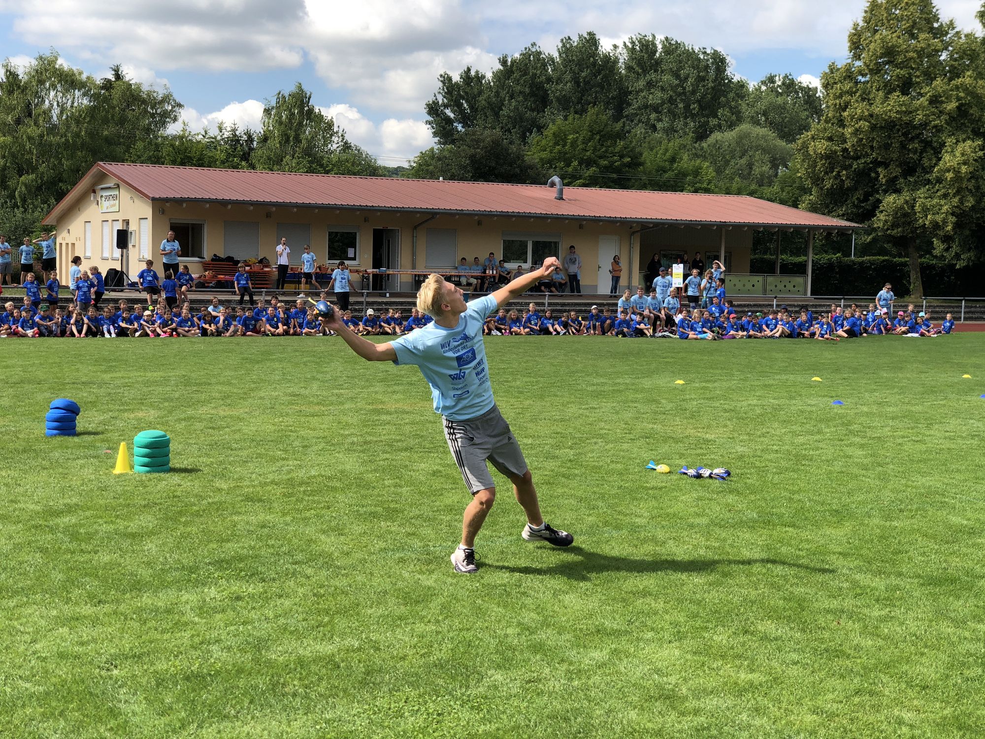 Die motivierten Helfer rund um Trainerin Christine Geldbach begrüßten bei strahlendem Sonnenschein das WLV-Team. Die 8 Stationen waren schnell aufgebaut, sodass alles bereitstand, als die Kinder eintrafen. Ausgestattet mit blauen T-Shirts gesponsert von der AOK und weiteren Projekt-Partnern konnte der spannende Sporttag beginnen. WLV-Praktikantin Maike Anstett bekam zum ersten Mal für die gesamte Veranstaltung das Mikrofon in die Hand und konnte damit innerhalb ihres Praktikums erste Moderations-Erfahrung sammeln.